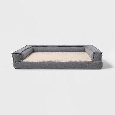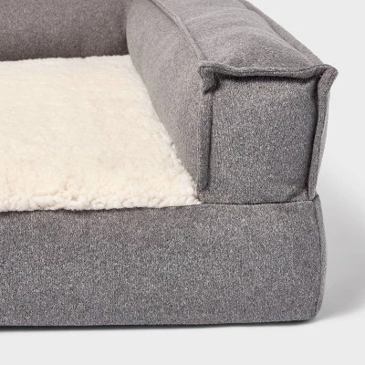 Create a comfy retreat for your pet friend with this Three-Sided Bolster Dog Bed from Boots & Barkley™. Designed in a classic rectangular silhouette, this dog bolster bed features a raised bolster sides on three sides to offer them a comfy place to rest their head. Draped in a soft fabric with soft foam filling, it features a faux-shearling surface for cozy comfort during nap time, sleeptime or simply while sitting. The non-slip base helps keep it in place, while the removable cover can be tossed in the washing machine for easy upkeep whenever needed. Featuring a gray hue with cream faux-shearling sleep base, it’s sure to complement your existing decor style.
