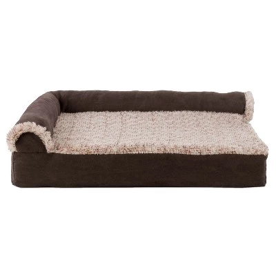 Pamper your pet with a Furhaven Deluxe Cooling Gel Memory Foam Orthopedic Two-Tone Plush Faux Fur & Suede L Shaped Chaise Lounge Sofa-Style Living Room Corner Couch Pet Dog Bed! A luxuriously soft faux fur sleep surface is complemented by suedine bolsters and gusset. Ultra plush, flecked faux fur provides a snuggly soft sleep surface and trims the edges of the bolster for a chic flair. The two-tone design hides dirt and pet dander better than traditional plush sleep surfaces. The L-shaped bolsters support your pet’s back and hips, providing additional support. The L-shape also provides the perfect nook for pets that like to nest into comfort. The two raised, rounded bolster ends allow your pet to lay their paws or neck on the pillowed edge, helping to align the neck and spine. The medical-grade foam core includes a layered orthopedic foam core topped with gel-infused memory foam. Micro gel beads help keep the bed cooler while memory foam conforms to your pet’s shape providing superior support of joints and pressure points. Gel foam has cooling properties reducing the sleeping surface by 1 or 2 degrees, wicking heat away from your pet. The superior support provided by both foam cores will help your pet reach a deeper, more restorative rest for your pet’s health. Available in various stylish colors and diverse sizing options so your pet can sprawl and lounge the day in maximum comfort and style.