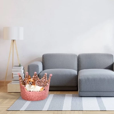 The Precious Tails Leopard Crown Bolster Cat & Dog Bed will give your pet the royal treatment they deserve! This cushy bed features a vegan leather exterior with a textured finish and interior faux fur with a leopard pattern for epic snooze fests. The interior cushion is removable for easy cleaning and filled with eco-friendly fiber made from recycled plastic bottles.